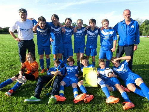 Nach einem 4:3 Erfolg nach Verlängerung gegen die SG Mußbach sicherte sich die D1 nach dem souveränen Staffelsieg in der Kreisliga Ost auch die Kreismeisterschaft. Dabei verlangte der Meister der West-Staffel den in mehrfacher Hinsicht gehandicapten FSV`lern alles ab. In der Anfangsphase beherrschten die 13er noch den Gegner und Torjäger Rui Ferreira (8.min) schloss nach Zuspiel von Yannick Minikus zur Führung ab. Danach fanden die Mußbacher über den Kampf zunehmend zum Spiel und kamen zu zwei guten Chancen, die der für den verletzten Stammkeeper Luca Betzer eingesprungene D2-Torhüter Jan-Alexander Hackmann parierte. In der 17. Minute wäre Rui Ferreira fast der zweite Treffer gelungen, doch er scheiterte am Aluminium. Durch zwei schön heraus gespielte Treffer (21.min u. 30.min) konnten die Mußbacher mit einer verdienten Führung in die Pause gehen. Auch nach dem Wechsel war der Gegner zunächst die bessere Mannschaft. Als in der 42. Minute durch einen unhaltbaren Weitschuß das 1:3 fiel schienen den an diesem Tag nicht überzeugenden FSV´lern die Felle davon zu schwimmen. Erst das 2:3 (48.min) durch einen verdeckten Schuß des eingewechselten Nico Steuerwald mobilisierte neue Kräfte und plötzlich spielten nur noch die FSV´ler. Durch eine umstrittene Aktion, bei der die Mußbacher vergeblich auf Abseits reklamierten, gelang Timo Sibilitz nach tollem Zuspiel von Christian Pereira 5 Minuten vor dem Ende der umjubelte Ausgleich. In der zwei Mal fünfminütigen Verlängerung schnürten die FSV´ler den Gegner im eigenen Strafraum ein. Nach vergebenen Chancen durch Diogo Marques Pereira und Rui Ferreira machte es ihr portugisischer Landsmann Christian Pereira besser, als er 4 Minuten vor Schluss nach toller Sibilitz-Flanke den Ball mit einer Direktabnahme mit dem linken Fuß volley zum Siegtreffer ins Netz donnerte. Mit einer unglaublichen Energieleistung hatte man ein fast aussichtsloses Spiel noch gedreht. Dies war umso höher zu bewerten, da mit Luca Betzer, Leonel Santos und Christopher Reichling 3 Stammkräfte fehlten. Darüber hinaus hatten 3 Spieler am Vormittag einen schulischen 3000m-Lauf zu absolvieren und Cedric Schiwek war gesundheitlich schwer angeschlagen.